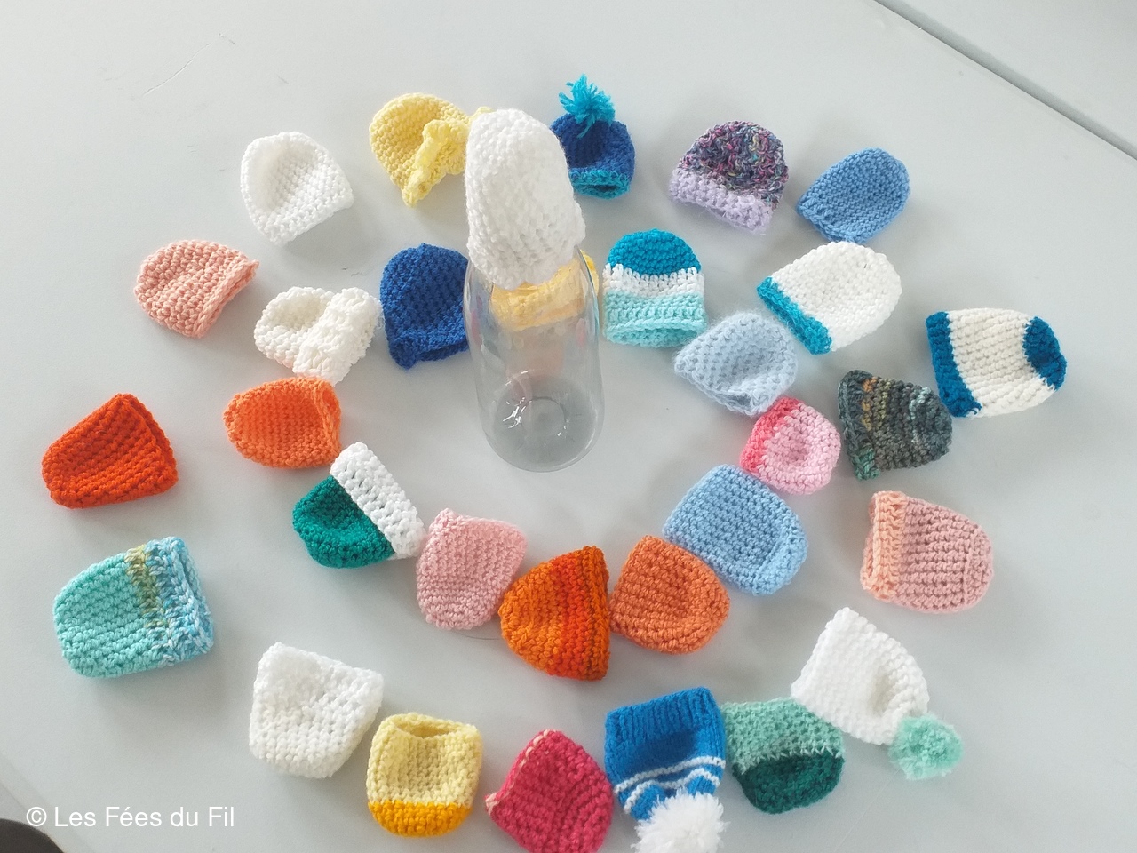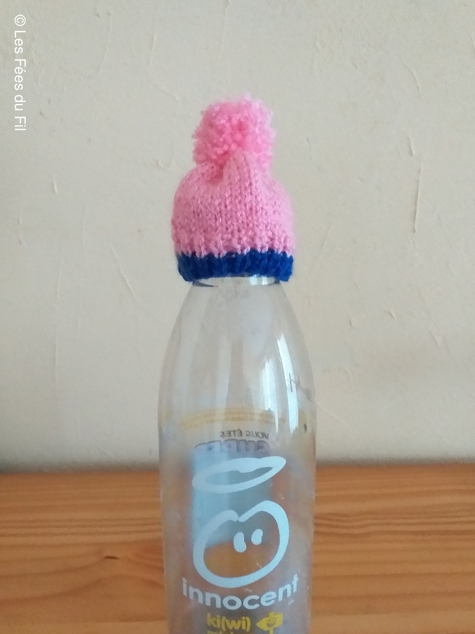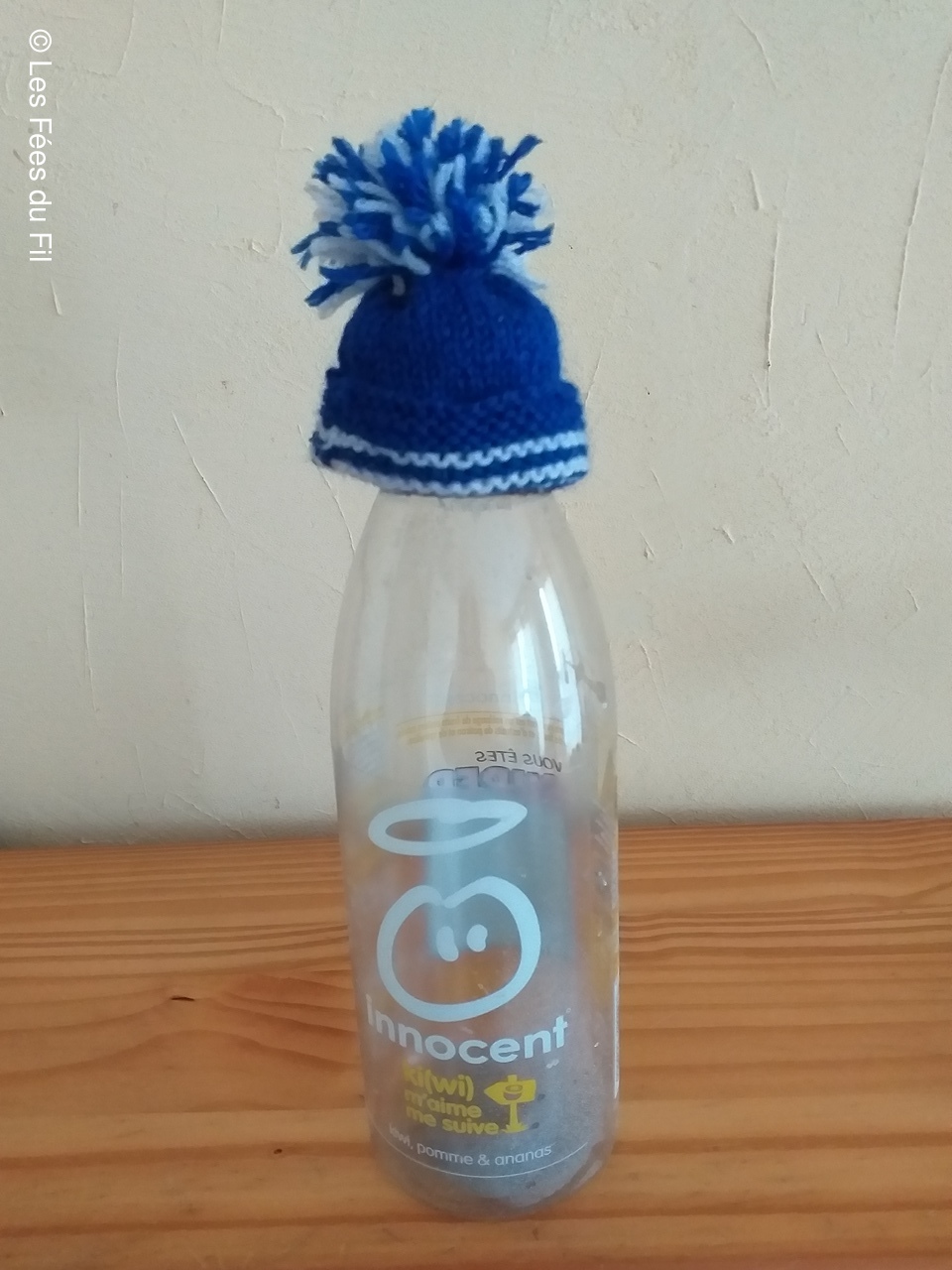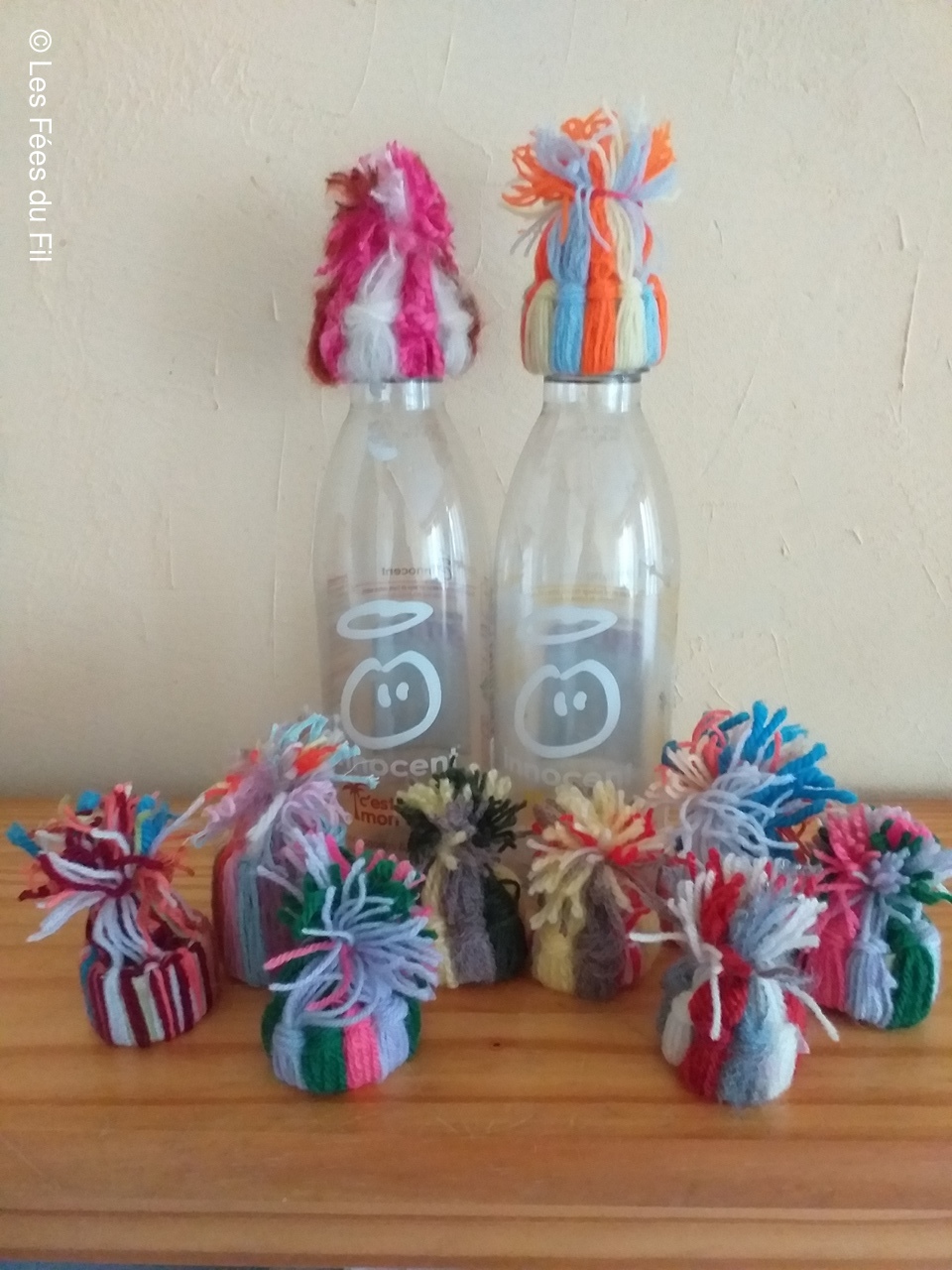 Confection de mini-bonnets qui seront apposés sur les bouteilles de smothies de la marque Innocent. Chaque bouteille vendue, coiffée d'un petit bonnet génére 0.20 centimes à l'association "Les petits frères des pauvres"